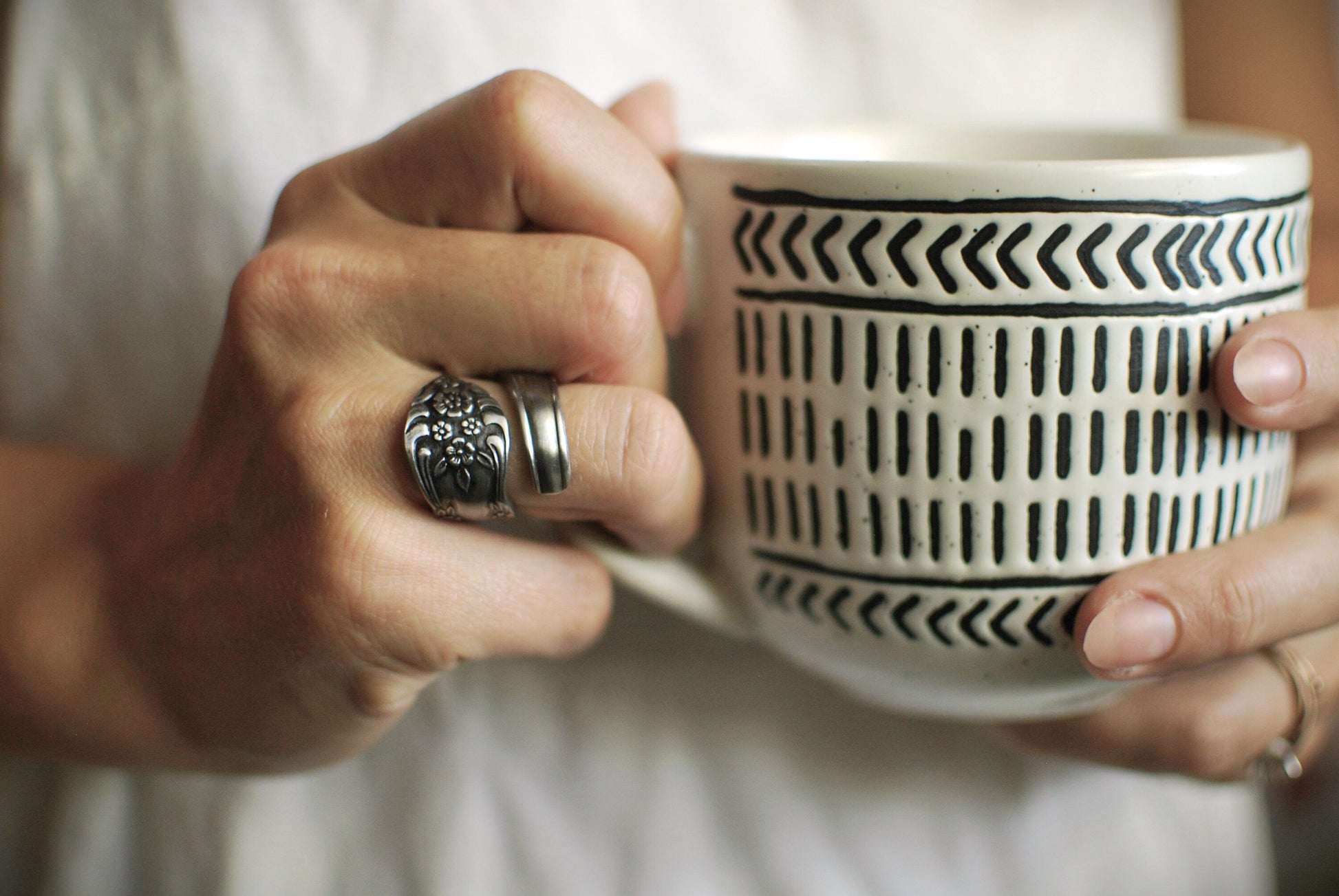 If you want a quick fix and are somewhat handy, adjusting the size is really quite easy. To make a spoon ring bigger, you can hammer it down on a metal mandrel, expanding the ring as you tap it down. If you do not have a metal mandrel, you can take two pairs of pliers (preferably with tape around the jaws to prevent scratching), and firmly but slowly pull the ends apart until it fits as desired.