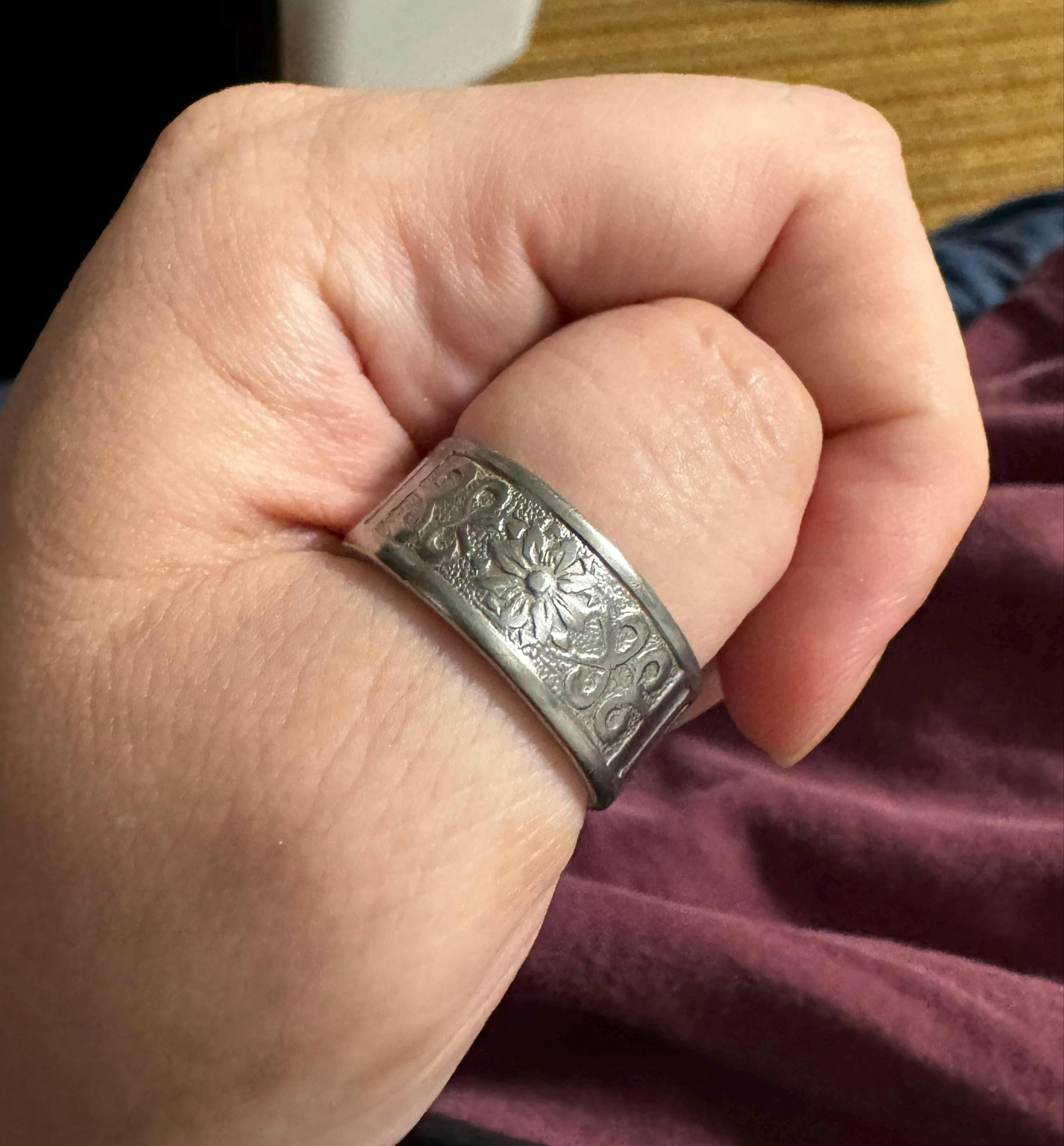 what to say! i sent in a spoon that i found in my great great grandmother's house in our homeland. brought it back to the states with me because i like the sunflowers on it. my family doesn't have much in the way of heirlooms, my parents came to the usa to escape a civil war, leaving everything behind. so when i saw this spoon, i had the idea to turn it into a ring and create something that connected me to my family heritage and that made the same pilgrimage as the family. only had one shot to get this right! it was the only spoon. now that i'm wearing it, with our last name engraved in the interior, i still can't believe it's mine. joey does top notch work and i will be forever grateful. look no further, you found the perfect shop.